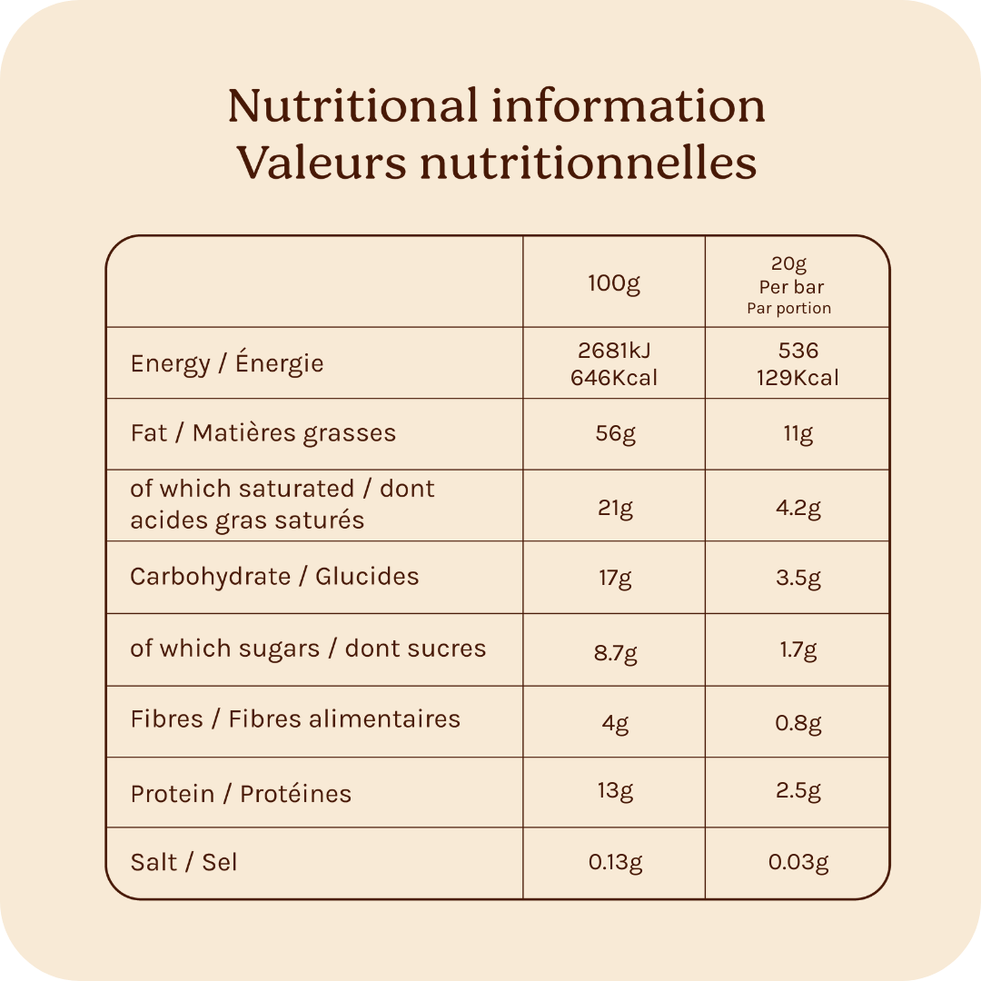 ♡ Nous sélectionnons uniquement des ingrédients biologiques de la plus haute qualité et privilégions des listes d’ingrédients courtes : des purées de noix naturelles, infusées de plantes, fleurs et fruits, enrobées de chocolat artisanal.