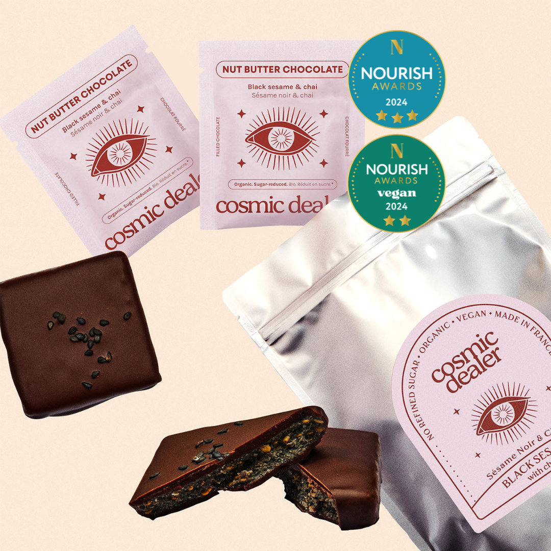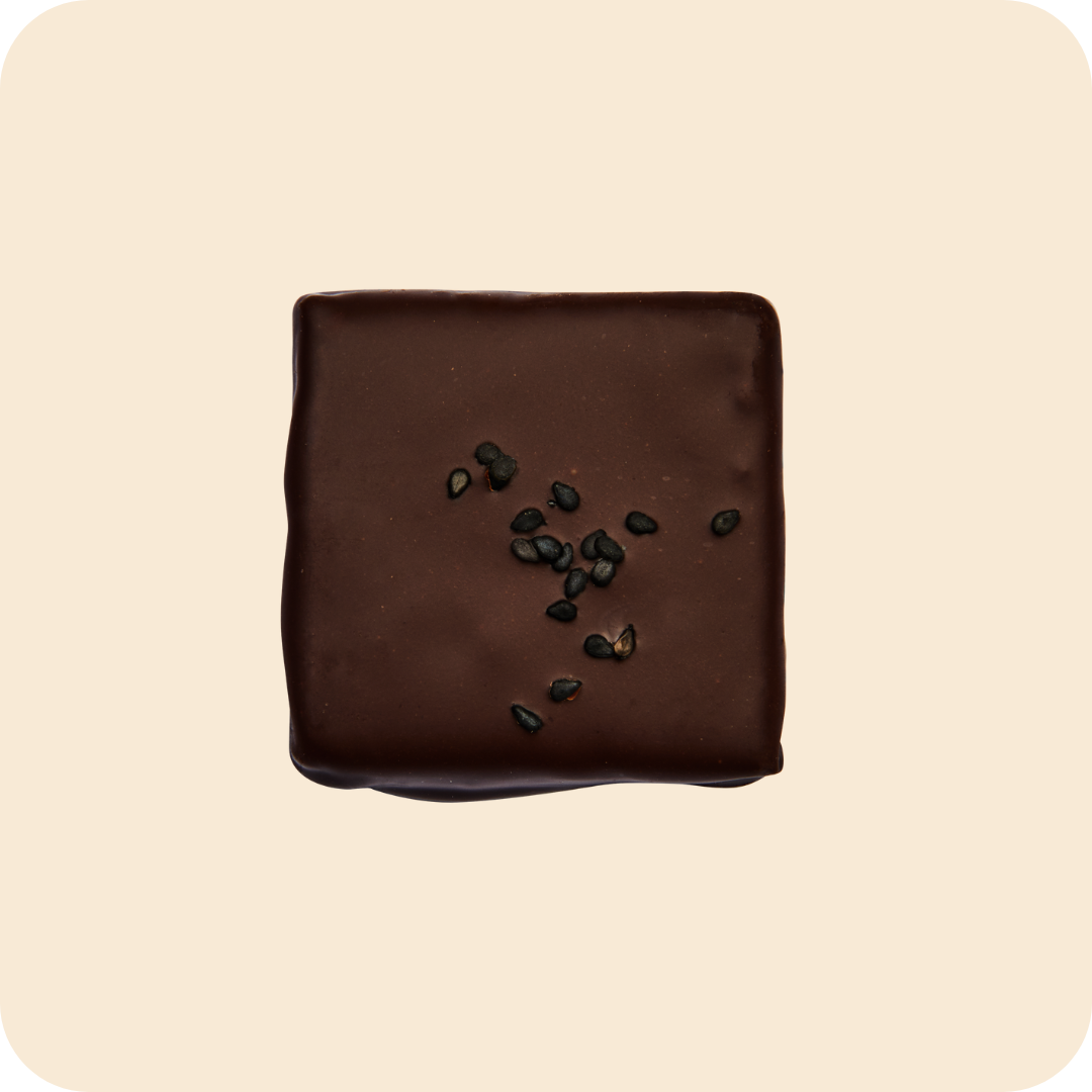 Pate de sésame noir (43%)*, Chocolat noir (cacao : 75%) (fèves de cacao*, poudre de dattes*), Beurre de cacao*, Sésame*, Sirop de datte*, Épices chai (cardamome verte*, poivre noir*, muscade*,