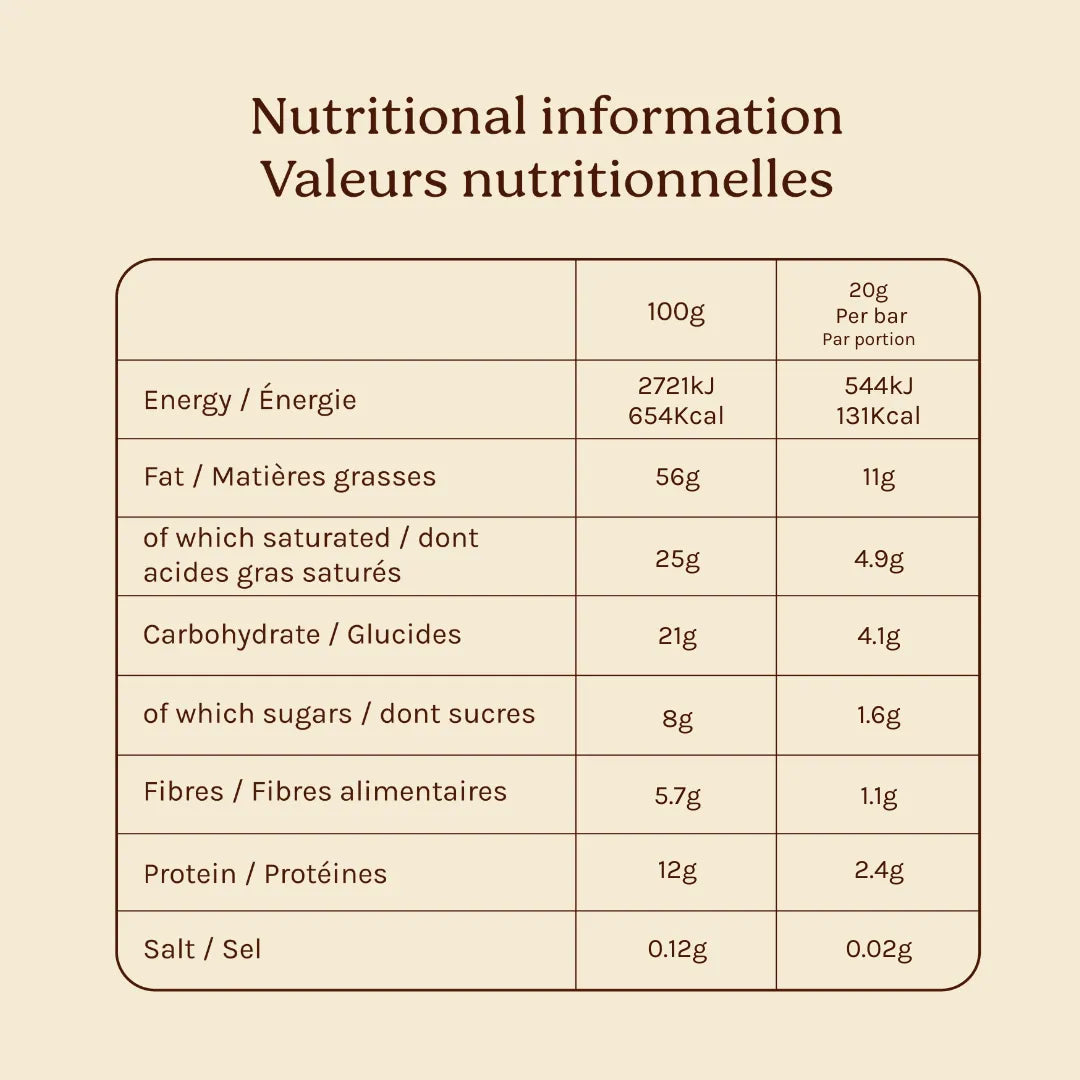 ♡ Nous sélectionnons uniquement des ingrédients biologiques de la plus haute qualité et privilégions des listes d’ingrédients courtes : des purées de noix naturelles, infusées de plantes, fleurs et fruits, enrobées de chocolat artisanal.