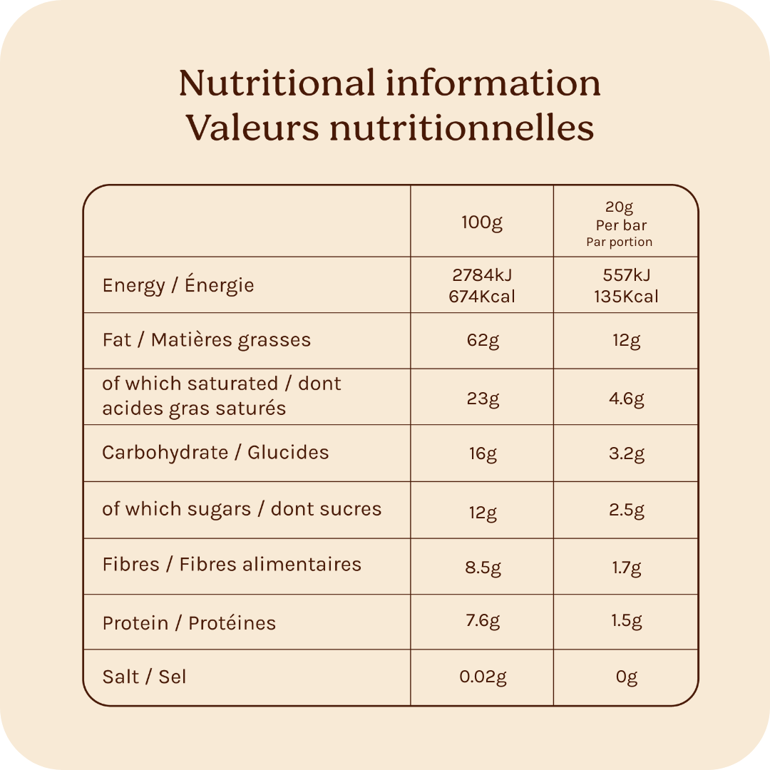 ♡ Nous sélectionnons uniquement des ingrédients biologiques de la plus haute qualité et privilégions des listes d’ingrédients courtes : des purées de noix naturelles, infusées de plantes, fleurs et fruits, enrobées de chocolat artisanal.
