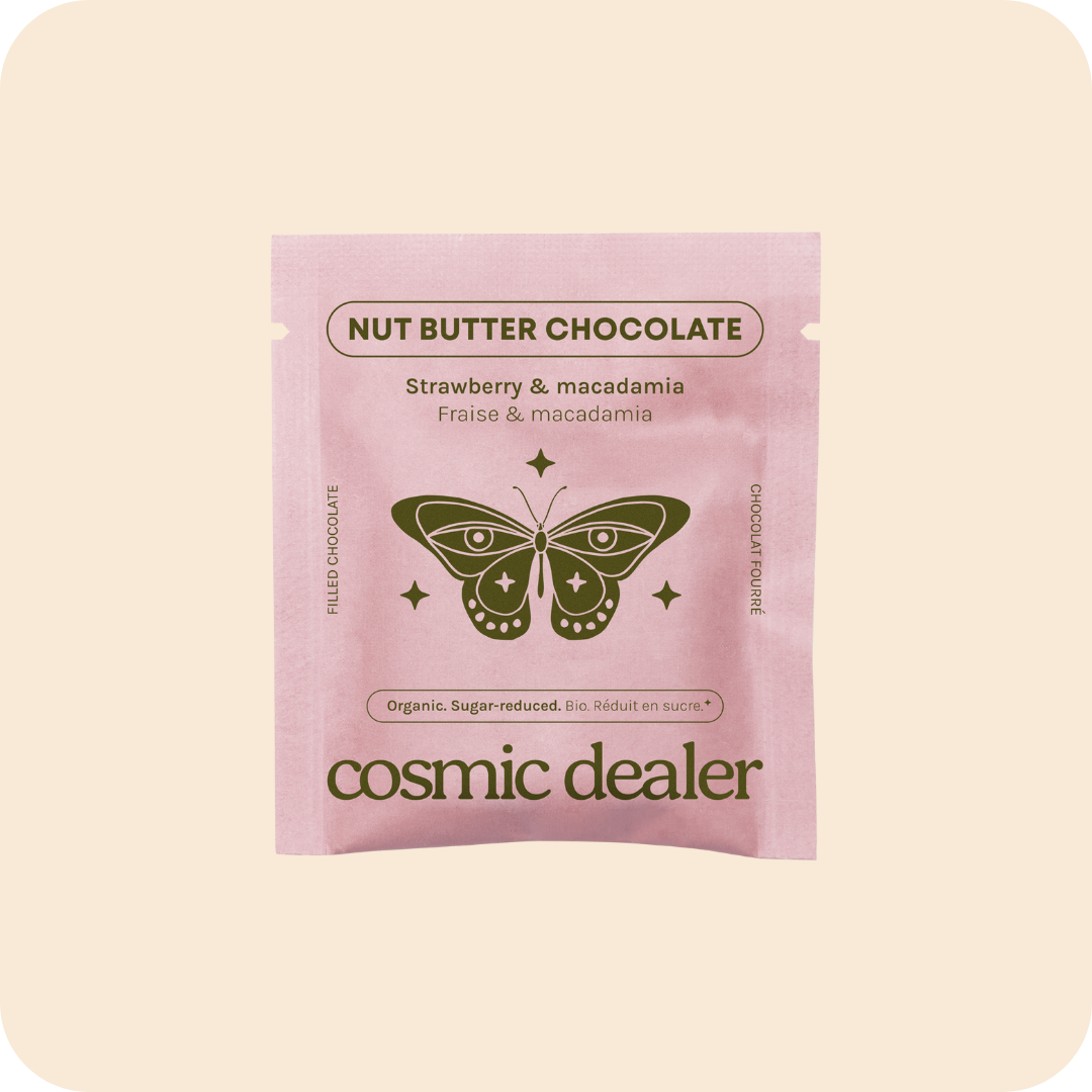 Une gourmandise sans culpabilité, alliant la richesse onctueuse des noix de macadamia à la douceur des fraises et au chocolat noir 75 % bio, pure origine (Équateur / République dominicaine / São Tomé).