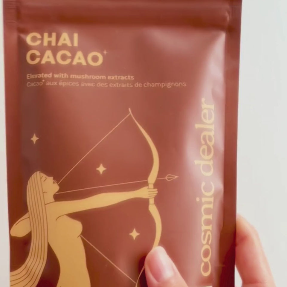 A deep chocolaty blend made with raw cacao beans, enhanced with lucuma, chai spices and mushroom extracts. An elevated, daily ritual that warms from within.