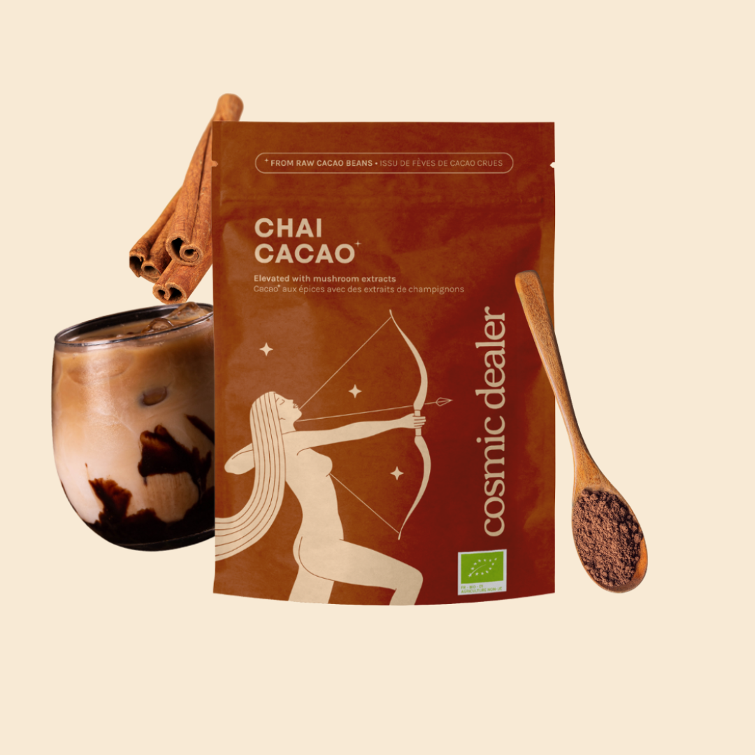 A deep chocolaty blend made with raw cacao beans, enhanced with lucuma, chai spices and mushroom extracts. An elevated, daily ritual that warms from within.