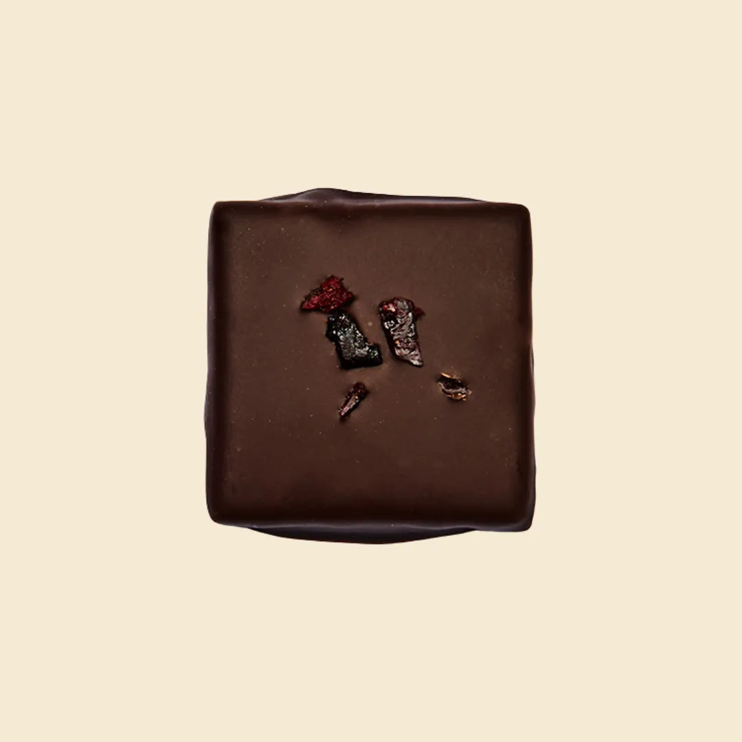 A nutritious treat, combing a chocolatey almond butter filling with staccatos of ruby red cherries. Their acidity connects perfectly with the chocolate for a very adult experience. Organic, single-origin, 75% dark chocolate.