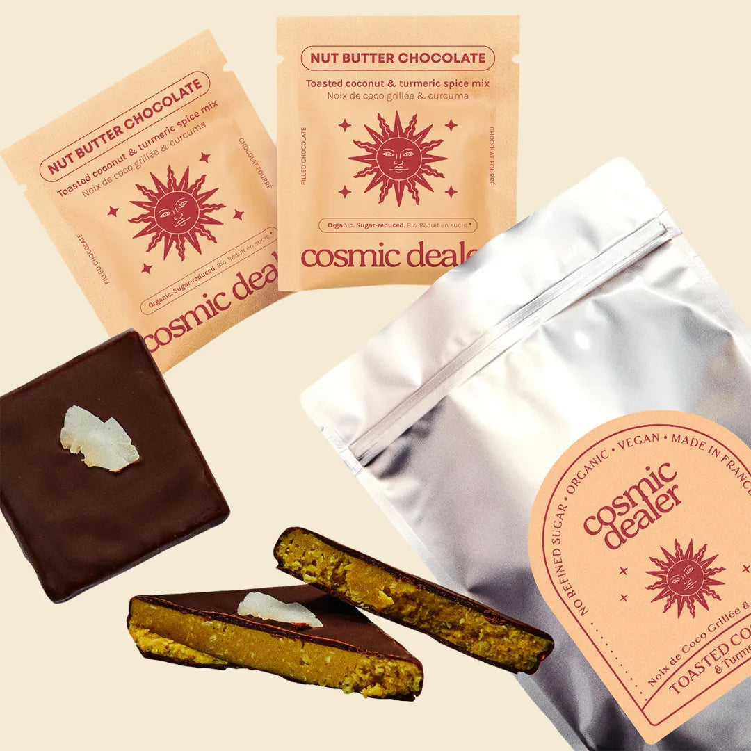 Large dark chocolate squares filled with almond butter, toasted coconut and turmeric spice mix.