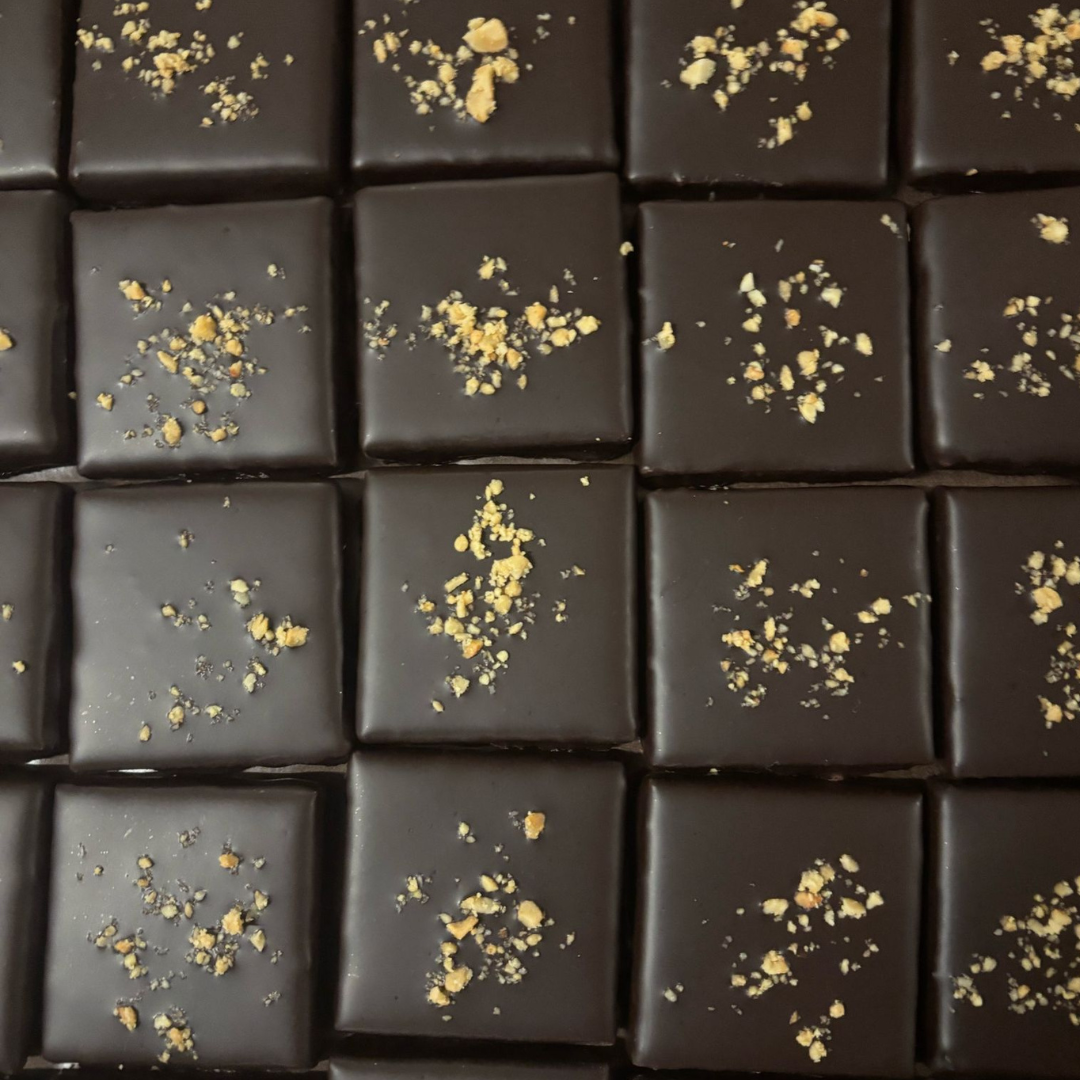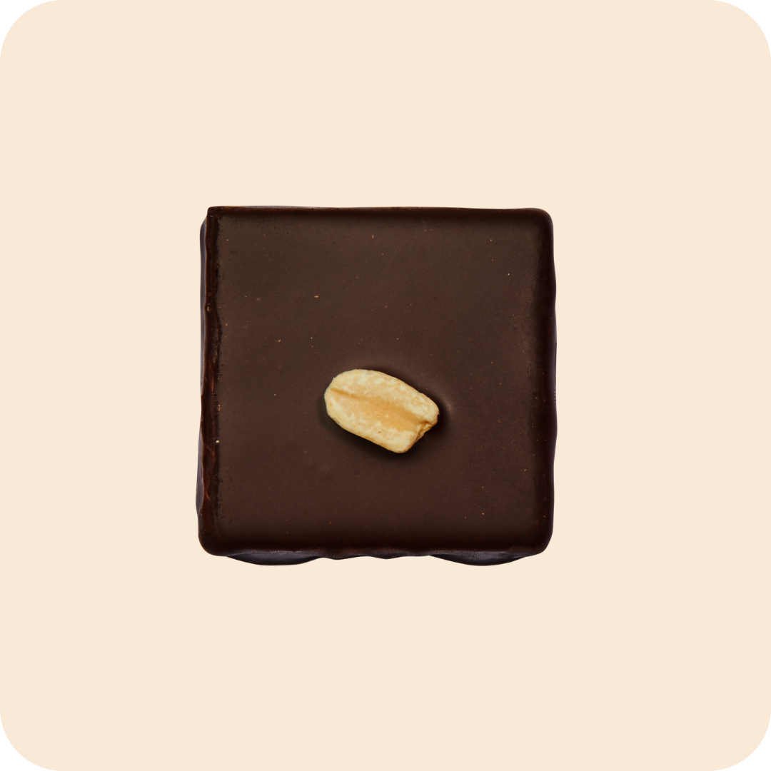Large dark chocolate squares filled with crunchy peanut butter and smoked salt.