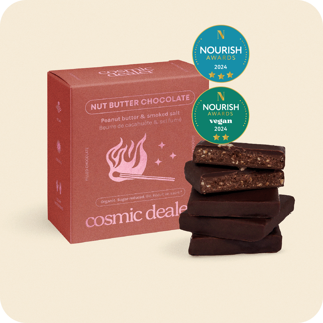 A nutritious treat, combining the best quality crunchy peanut butter with a pinch of smoked salt and organic, single-origin, 75% dark chocolate.