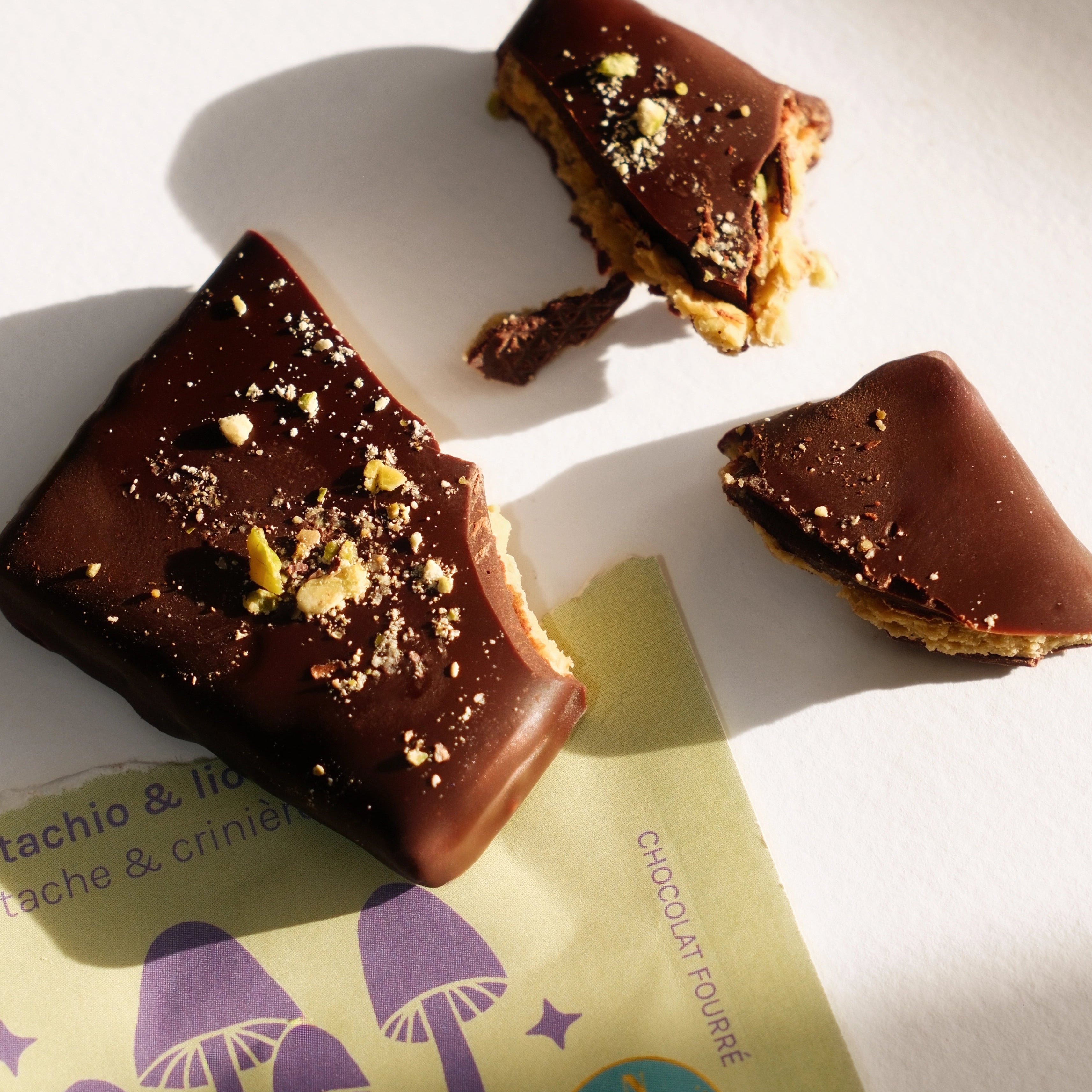 Four large dark chocolate squares filled with pistachio nut butter and Lion’s Mane mushroom extract.