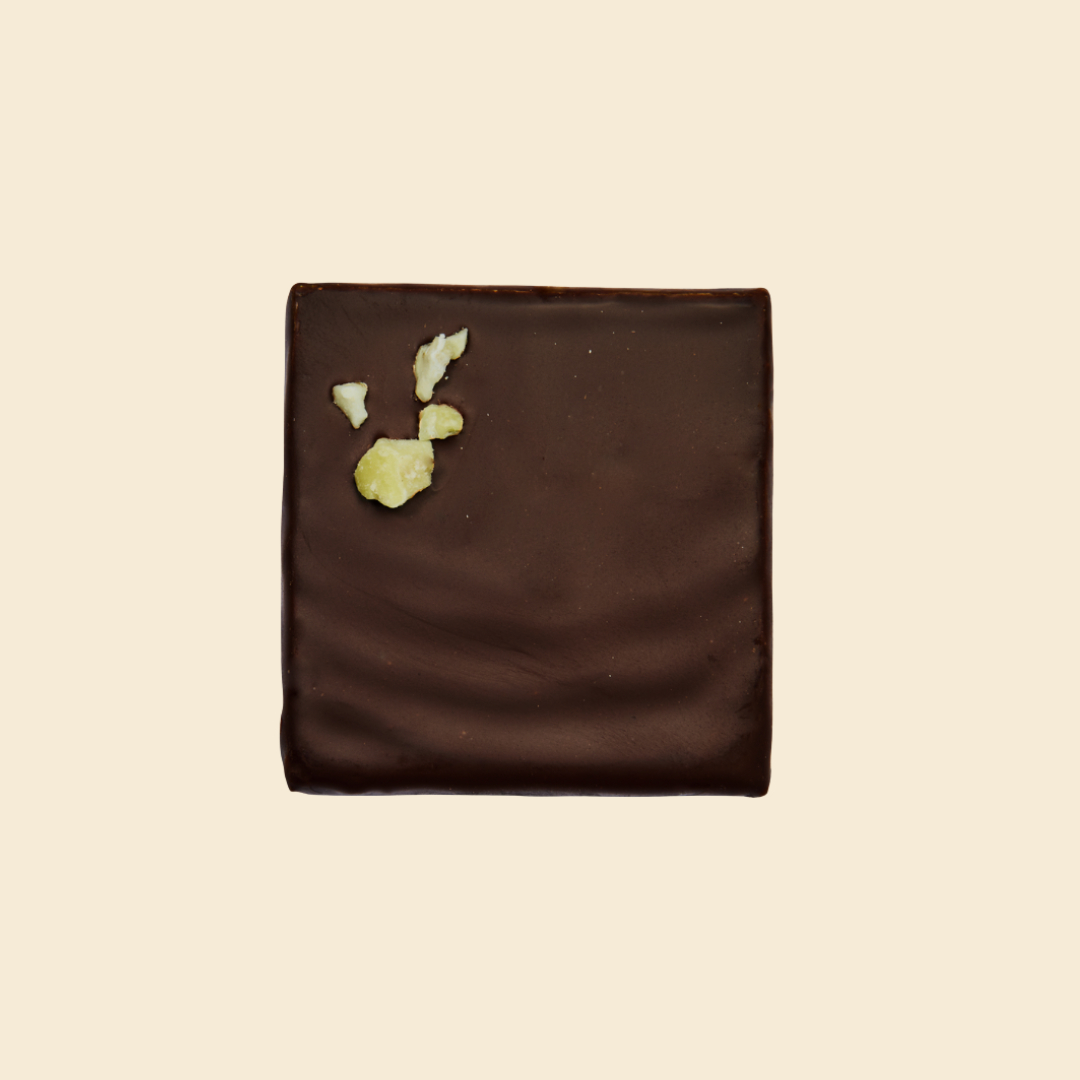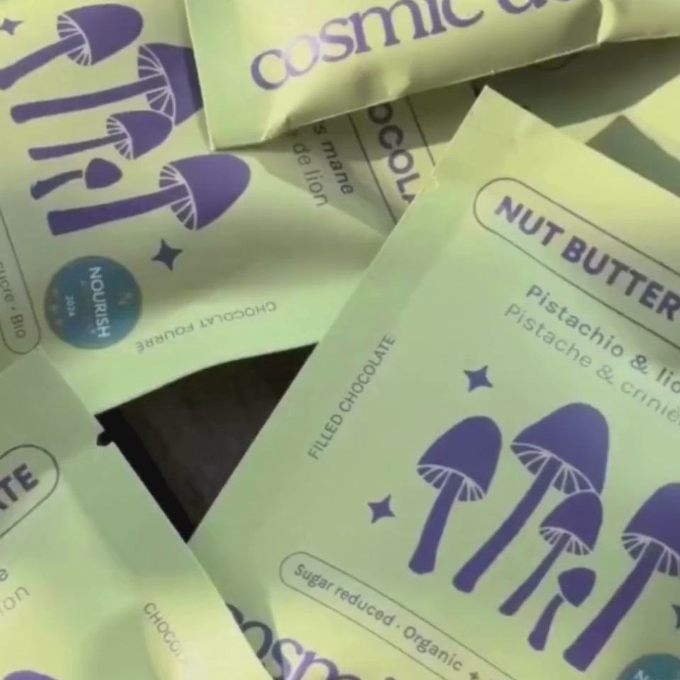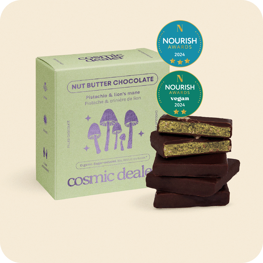 A nutritious treat, combing pistachio nut butter and crunchy pistachios, spiked with extract of wonder mushroom Lion’s Mane - all dipped in organic, single-origin, 75% dark chocolate.